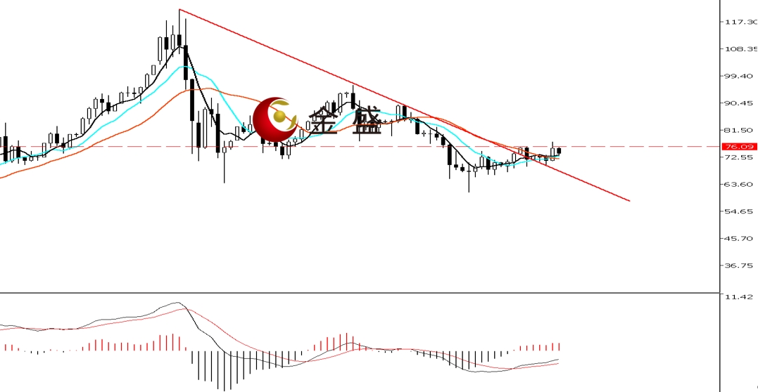 前一个交易日,早盘时段,受避险情绪降温,白银一小时飙升逾三美金,午后涨势减缓,价格创当日高点77.59美元。晚盘时段,美伊局势再度生变,白银连续阴线下挫,多头回吐部分涨幅,最终收有上影线的阳K。均线系统收敛走平,价格围绕其震荡。MACD指标快慢线零轴下方现金叉,做多的动能为主。白银震荡偏反弹,价格突破图示的压力线。昨日行情先涨后调,盘中刺破上周高点有回落,可见76美元上方有压力。行情或重新进入震荡格局,操作上高抛低吸。