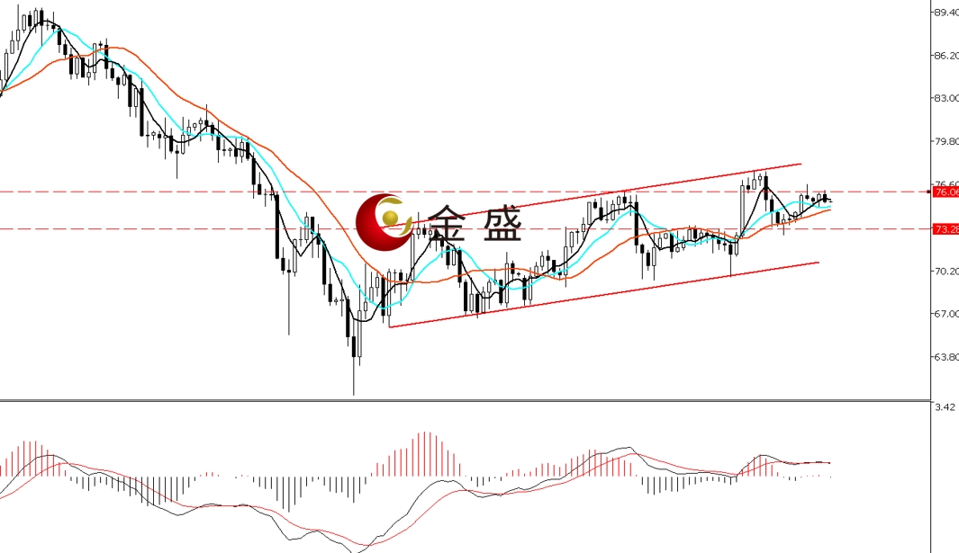 前一个交易日,白银走势与黄金同步,行情白盘蓄势为主,晚盘叠加消息利好持续上行,最终收涨近2%。今天日内价格下跌后反弹,多头坚守75美元大关。四小时周期,均线系统不断收敛,价格围绕其震荡。MACD指标快慢线零轴上方走平,多空动能不明。白银走势形成上行通道,昨日反抽76美元一带承压调整。今天日内行情围绕此压力横盘整理,多头表现偏强,行情或继续反扑。短期关注73—76区间的突破,操作上低吸为主。