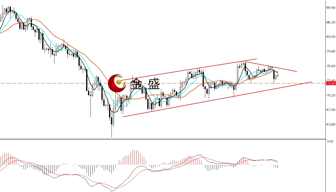 前一个交易日,白银周内高点附近窄幅整理,价格先跌后涨走V字型,最终收小阳线。今天早盘受周末消息影响,银价低开低走,盘中最大跌幅逾2%,午后有所反扑。四小时周期,均线系统收敛向下拐头,对价格反弹形成压制。MACD指标快慢线零轴上方现死叉,做空的动能为主。白银走势形成上行通道,行情继续73—76区间的震荡,76美元附近正好是日内跳空缺口的上轨,短期看周末美伊消息对盘面的打压力度。一旦多头有效突破76美元关口,则后市偏向继续反弹,反之将震荡下行,操作上高抛为主。