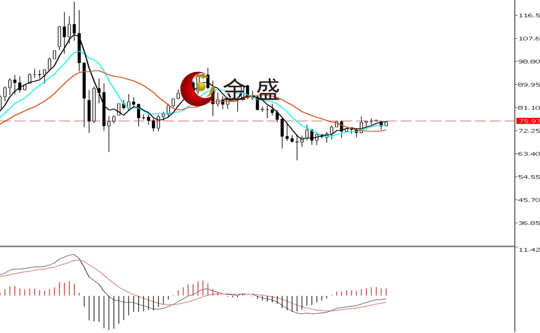 前一个交易日,早盘时段,白银低开低走,开市一小时下挫三美金,价格创当日低点72.62美元后有所反抽。欧美盘时段,行情围绕74美元关口横盘震荡为主,最终收阴线。均线系统收敛走平,布林带中轨对价格形成支撑。MACD指标快慢线零轴下方现金叉,做多的动能为主。今天凌晨行情快速拉升至76美元附近,价格反抽至昨日跳空缺口一带。可见周末利空的消息对盘口打压有限,后市偏向依托73美元关口震荡上行。