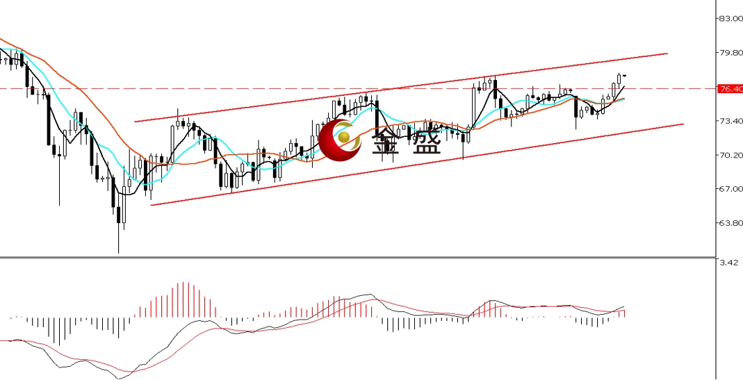 前一个交易日,白银走势与黄金同步,早盘跳水下挫逾2%,随后有所反扑,日图收阴线。随着地缘局势好转,白银自74美元关口形成单边上行,午后价格一度突破上周高点,日内涨幅超3%。四小时周期,均线系统收敛向上拐头,对价格反弹形成支撑。MACD指标快慢线零轴上方现金叉,做多的动能为主。白银反弹形成图示的上行通道,昨日回踩73美元关口止跌回升,技术面形成小双底结构。随着价格突破颈线76美元一带,确认反弹空间升级,后市关注通道上轨80美元一带的压力。