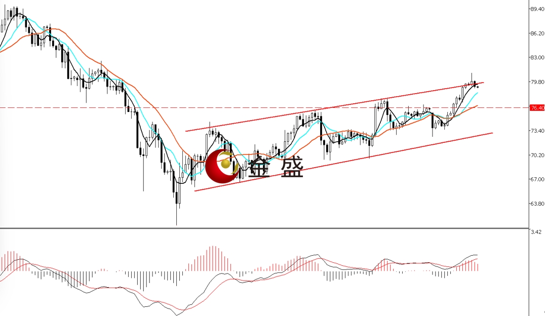 前一个交易日,白银表现较强,价格单边上行至80美元附近,当日上行逾5%。今天日内先涨后跌走尖顶结构,午后价格回落至日内低点附近。四小时周期,均线系统收敛向上拐头,对价格反弹形成支撑。MACD指标快慢线零轴上方现金叉,做多的动能为主。白银反弹形成图示的上行通道,早盘价格刺破通道上轨有调整,压力位还未有效突破,80美元上方的压力明显。短期不能继续拉升,则偏向技术性调整,下方强支撑关注76美元一带,操作上高抛低吸。