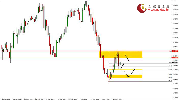 现货白银周四(5月18日)亚盘和欧盘快速冲低后拉升,美盘大幅回落。上方关注16.77-17.00美元/盎司区间,有机会二次冲高的话,该区间为做空较好的区域。下方关注16.40美元/盎司附近的支撑,若有机会回调16.20美元/盎司附近则做多。总体而言目前白银较为难操作。
