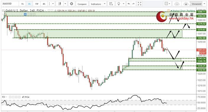 现货黄金周三(5月24日)亚盘和欧盘小幅震荡下行后有所回升,总体变化不大。上方依然重点关注1262-1271美元/盎司区间的阻力,昨日说过如果触及有极大的几率会回调或者类似左侧进行区间震荡,目前看如果有反抽1262附近依然可以做空。下方可以重点关注1240-1243美元/盎司区间,回调该区间可以做多。