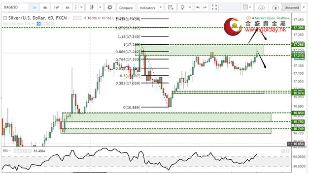 现货白银周五(5月26日)亚盘和欧盘持续震荡上行,再度测试上方阻力区间。上方关注17.21-17.28和17.40美元/盎司区间的阻力,达到17.21-28美元/盎司区间可以尝试做空,突破则目标看17.40。下方关注17.08-17.00美元/盎司区间的支撑,可以选择回调做多。