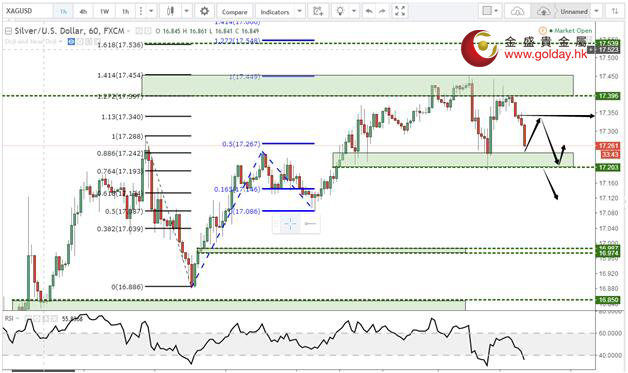 现货白银周二(5月30日)再度测试前高阻力区域后,开始持续大幅震荡走弱。上方关注17.35和17.40-17.45美元/盎司区间的阻力,达到17.35美元/盎司区间可以尝试做空,突破则目标看17.40。下方关注17.20-17.25美元/盎司区间的支撑,可以选择回调做多。