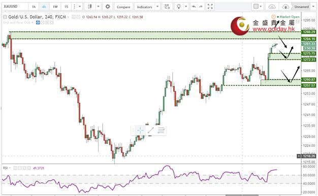 现货黄金周一(6月5日)亚盘和欧盘基本维持在高位震荡的走势中,市场交投谨慎。上方可以重点关注1284-1288美元/盎司区间的阻力。下方可以重点关注1272-75和1257-1260美元/盎司区间,回调该区间可以做多。