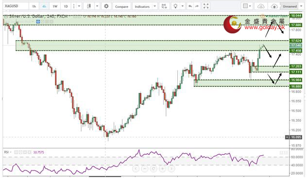 现货白银周一(6月5日)亚盘和欧盘也是处于高位的横盘震荡状态中,暂无明显的波动。上方关注17.45-17.62美元/盎司区间的阻力,未突破之前不要追对,若突破可以关注17.88-18.04。下方关注17.11-17.20和17.98-16.88美元/盎司区间的支撑,短线可以选择回调短多。