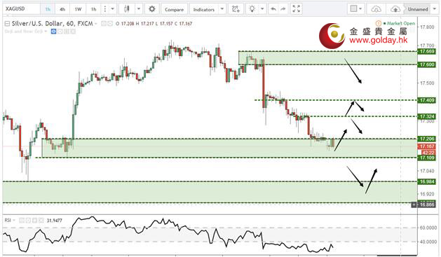 现货白银上周五(6月9日)亚盘和欧盘小幅震荡下行后有所企稳,美盘持续震荡下行。上方关注17.32、17.40和17.59-17.67美元/盎司区间的阻力。下方关注17.20-17.10和17.00-16.88美元/盎司区间的支撑,短线可以选择回调短多。