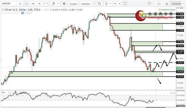 现货白银周二(6月20日)亚盘和欧盘基本维持小幅震荡上行的走势,美盘也是再度回踩下方支撑区域后反弹。上方关注16.97-17.06和17.30-17.45美元/盎司区间的阻力。下方关注16.43-16.33美元/盎司区间的支撑,短线可以选择回调短多,目前弱势下行格局未改,关注前高16.62美元/盎司的突破情况。如果下破16.33则观望暂时不操作了。