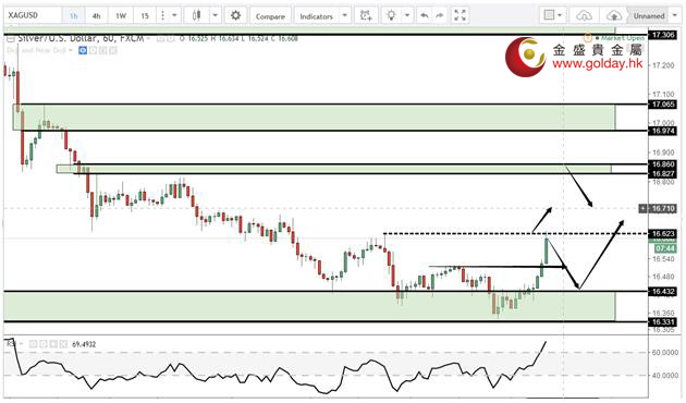 现货白银周三(6月21日)亚盘和欧盘维持低位震荡的走势,美盘深度回踩支撑后大幅走高。上方关注16.97-17.06和17.30-17.45美元/盎司区间的阻力。下方关注16.43美元/盎司的支撑,回调该位置继续做多,止损16.33一线,下破之后就不做。