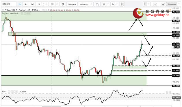 现货白银周五(6月23日)亚盘和欧盘继续震荡走高。上方关注16.97-17.06和17.30-17.45美元/盎司区间的阻力。下方关注16.62、16.53-16.50和16.48-16.46美元/盎司的支撑,回调该位置继续做多。目前我们倾向于回调做多。