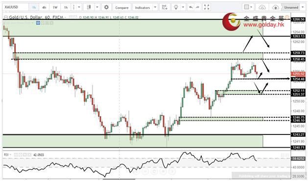 现货黄金上周五(6月23日)亚盘和欧盘持续震荡上行,再次拉升突破前高,美盘二次冲高没有冲破前高。上周五短线密切注意上方1258-1260美元/盎司区间的阻力,首次触及也可尝试做空,可以看到该区间依然有残余的卖盘,如果突破该区间,需要关注1263-1267美元/盎司的阻力区间,观点保持不变。下方可以关注1254和1252-1251美元/盎司的支撑,1254是颈线部位,若下破可能今日短线走弱的概率偏大,没下破1254之前仍属于上升形态未变。