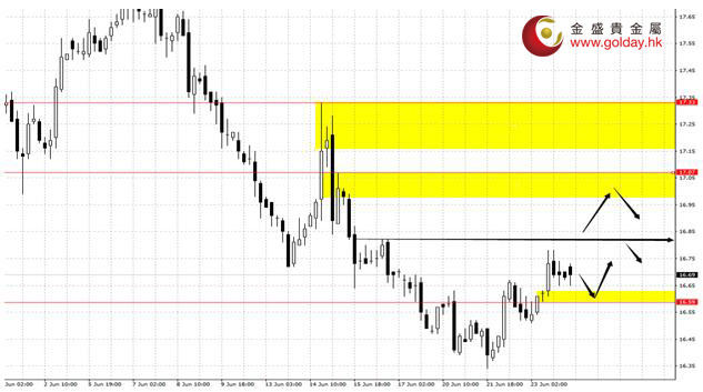 现货白银上周五(6月23日)亚盘和欧盘继续震荡走高,美盘基本维持高位震荡。上方关注16.97-17.06和17.30-17.45美元/盎司区间的阻力。下方关注16.62、16.53-16.50和16.48-16.46美元/盎司的支撑,回调该位置继续做多。目前我们倾向于回调做多。