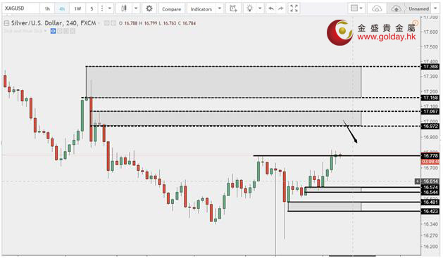 现货白银周三(6月28日)亚盘和欧盘震荡上行,偏高位震荡。昨日和大家说过上方关注16.67-16.77、16.97-17.06和17.30-17.45美元/盎司区间的阻力。但是昨晚也说过不太建议在16.67-16.77区间做空,做多最好等上破16.77,上方空间打开的。下方关注16.57-16.53、16.48-16.42和15.65-15.75美元/盎司的支撑,回调该位置继续做多。