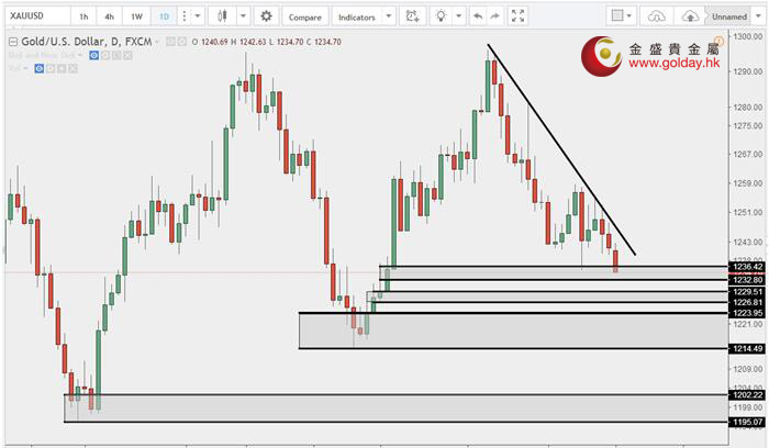 现货黄金周一(7月3日)亚盘和欧盘延续震荡下行的走势,再次测试下方支撑区域。目前尚未出现行情企稳的迹象。短线下方可以先关注1232.80-1236.20的支撑区域,但该区域由于被触及过一次,因此需要确认入场,有一定的下破可能性。下方关注1229-1118和1223.50-1214,该区域属于强势买盘区域。上方短线可以关注1240.70-1242.60和1246.30-1248美元/盎司区域。