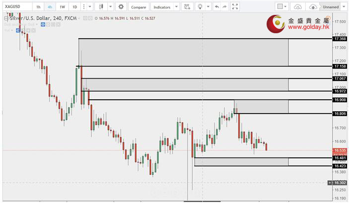 现货白银周一(7月3日)亚盘和欧盘依然维持震荡下行的走势。上方关注16.80-16.90、16.97-17.06和17.30-17.45美元/盎司区间的阻力。下个关注16.48-16.42、15.65-15.75的买盘支撑区域。整体形态依然偏空,且目前尚未有较好的利多消息支撑。