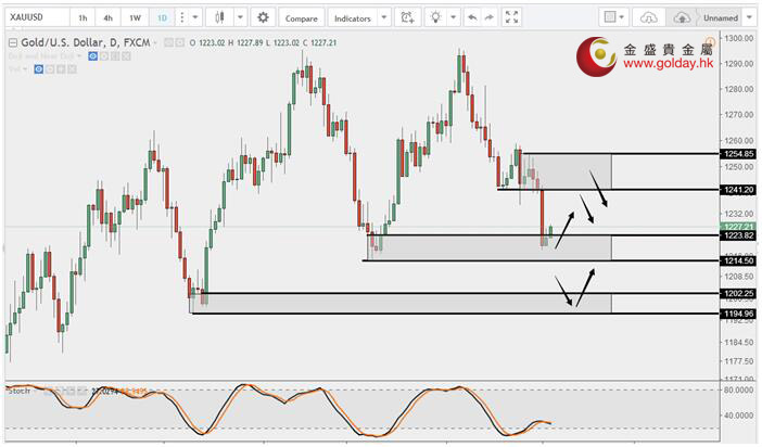 现货黄金周二(7月4日)亚盘和欧盘基本呈现低位震荡的走势,暂时还不能确认下方空间已经到位,建议抄底的还有再等一等。目前下方就是重点关注1223.50-1214,该区域属于强势买盘区域。若下破则需要向下继续看到1202-1194美元/盎司区域。上方短线可以关注1240.70-1242.60和1246.30-1248美元/盎司区域。