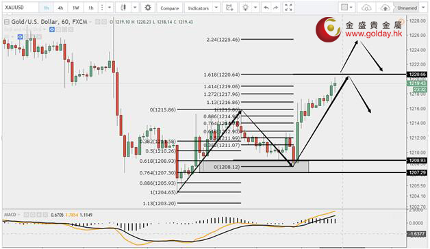 现货黄金周二(7月11日)亚盘和欧盘再度小幅震荡走低,完美达到我们昨天做多的区间,美盘受邮件门事件影响大幅走高。之前我们说下方可以重点关注1203和1189美元/盎司附近,分别是黄金分割1.13和1.27黄金分割的位置,获得支撑可以考虑做多,昨日也说过如果要想确认黄金在1204企稳,小时级别这次的回调最好不要下破1209-1207美元/盎司区间。目前上方重点关注1220.60、1225.50和1230美元/盎司附近。下方暂时关注1208-1220这段黄金分割的0.382、0.5和0.618三线1212-1215区间。因为晚间有耶伦讲话,不排除回调会下破0.618一线。