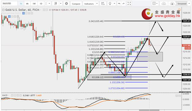 现货黄金周三(7月12日)亚盘和欧盘再度小幅震荡走低。之前我们说下方可以重点关注1203和1189美元/盎司附近,分别是黄金分割1.13和1.27黄金分割的位置,获得支撑可以考虑做多,昨日也说过如果要想确认黄金在1204企稳,小时级别这次的回调最好不要下破1209-1207美元/盎司区间。早间说过,目前上方重点关注1220.60、1225.50和1230美元/盎司附近。下方暂时关注1208-1220这段黄金分割的0.382、0.5和0.618三线1213-1216区间。因为晚间有耶伦讲话,不排除回调会下破0.618一线。维持观点不变。