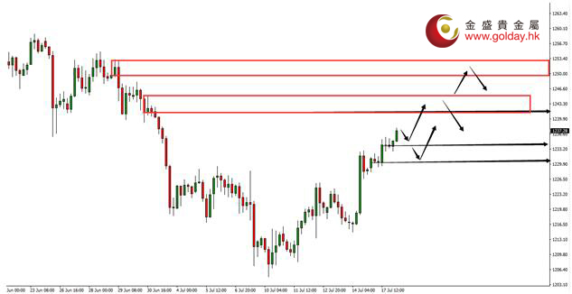 现货黄金周一(7月17日)亚市早盘开于1228.58美元/盎司,最低下探1227.80美元/盎司,最高上涨至1235.94美元/盎司,收于1233.88美元/盎司,上涨5.48美元,涨幅0.43%。