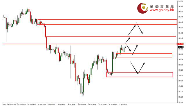 现货白银周一(7月17日)亚盘和欧盘基本维持小幅横盘震荡的走势,美盘震荡上行,昨日说过考虑到上方阻力已经测试了两次,因此后面突破的概率大,上方关注16.00-16.20、16.35和16.57-16.73美元/盎司的支撑,首次反抽这两个区间可以考虑做空,昨晚已经完成了首次触及。回落下方可以关注16.00整数关口附近的支撑。