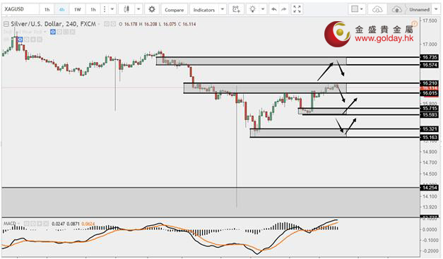 现货白银周二(7月18日)亚盘和欧盘基本维持高位小幅横盘震荡的走势,昨日已经说过考虑到上方阻力已经测试了两次,因此后面突破的概率大,上方关注16.00-16.20、16.35和16.57-16.73美元/盎司的支撑,首次反抽这两个区间可以考虑做空,昨晚已经完成了首次触及。回落下方可以关注16.00整数关口附近的支撑。