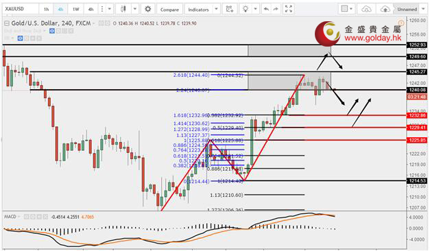 现货黄金周三(7月19日)亚盘和欧盘小幅震荡下行,美盘二次冲高暂没破前高。上方依旧关注1240-1245和1250-1253美元/盎司区间,首次达到区间可以做空。下方目前关注1234-1233、1231-1229和1225美元/盎司区间,回落获得支撑可以做多。目前反弹形态良好,高点和低点逐渐抬高的形态未改变之前,思路尽量以回调做多为主,目前1255是多头趋势的多空分水,不破1255从技术上都要看多头。