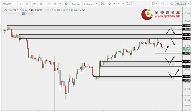 现货白银周三(7月26日)亚盘和欧盘持续小幅震荡下行。上方关注16.58-16.66和16.80-16.90美元/盎司的阻力,首次触及可以考虑轻仓试空,下方关注16.22、16.03-15.95和15.60-15.68美元/盎司两个支撑位。如果下破16.22短线恐短线会继续回调。