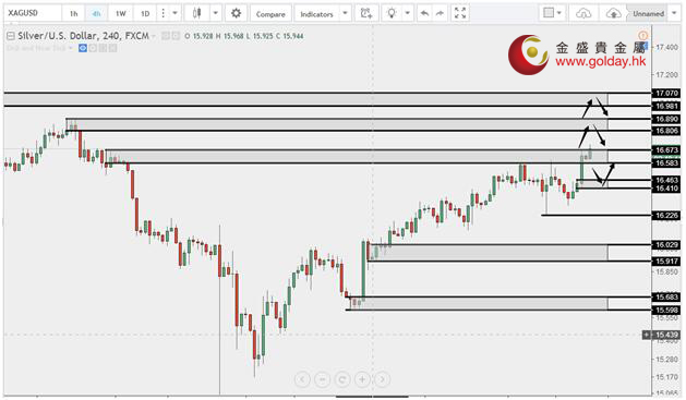 现货白银周三(7月26日)亚盘和欧盘持续小幅震荡下行,美盘出现大幅走高。上方关注16.80-16.90和16.98-17.07美元/盎司的阻力,首次触及可以考虑做空,下方关注16.46-16.40和16.22美元/盎司两个支撑位。