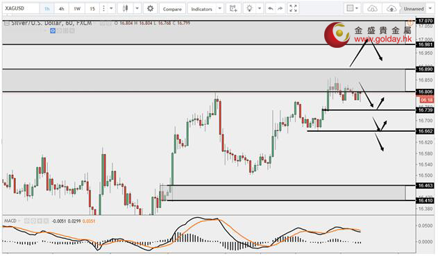 现货白银周一(7月31日)亚盘和欧盘维持小幅高位震荡走势,美盘也基本维持高位震荡的走势,总体变化不大。上方关注16.80-16.90和16.98-17.07美元/盎司的阻力,首次触及可以考虑做空,,如果今日上破16.90一线,可以选择我17.00做空。下方关注短线可以关注16.73、16.66、16.46-16.40和16.22美元/盎司几个支撑位。