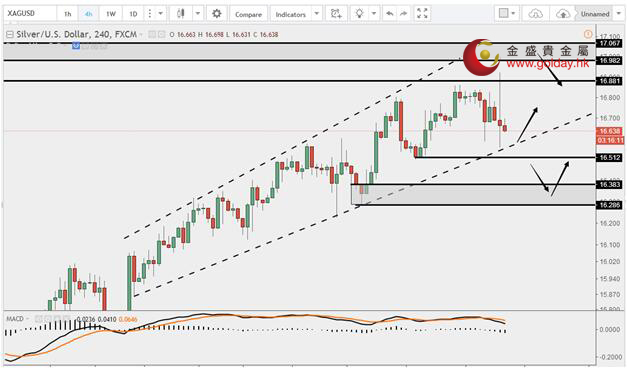 现货白银周三(8月2日)亚盘和欧盘小幅下次。上方关注前高和16.98-17.07美元/盎司的阻力,首次触及可以考虑做空,因为16.88已经上破,那块区域的卖盘基本消化完成。下方关注短线可以关注趋势线、16.51、16.38-16.28美元/盎司几个支撑位。