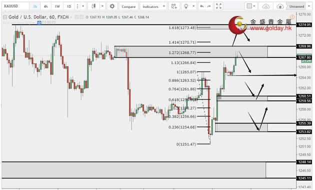 现货黄金周三(8月9日)亚盘和欧盘基本维持小幅横盘上行的走势。上方主要关注区域是1267.80-1270美元/盎司区间,首次触及可以考虑做空,若突破就要再次看到大周期1.618的外部扩展1273和1275-1281美元/盎司阻力区间。下方关注1262、1260.50-1259.50和1255.40-1253.80美元/盎司区间,回落区域可以考虑做多。