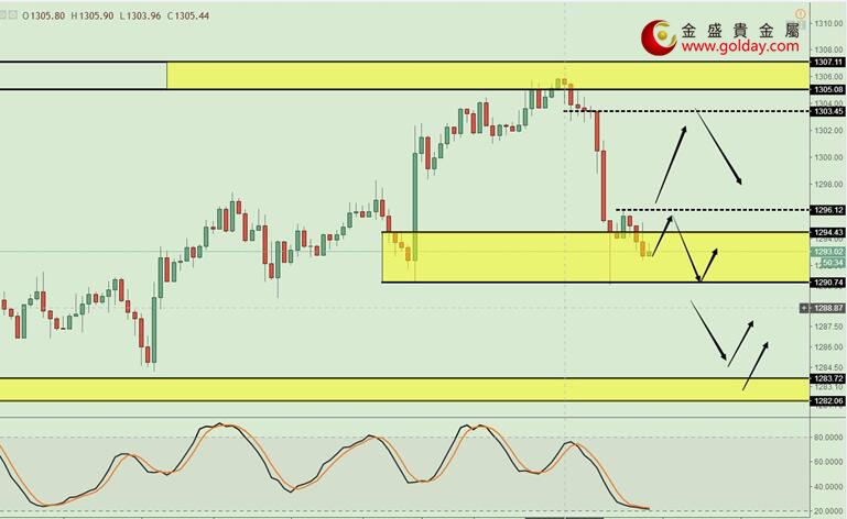现货黄金周一(10月16日)亚盘和欧盘基本维持小幅的高位震荡,美盘大幅走弱,上周给过1305-1307的阻力区间。昨日晚评说过目前看上方的阻力区间依然是1305-1307区域,若上破,上方需要关注1312-1314美元/盎司的阻力区域。目前上涨趋势还没有发生改变,短线前低为1300一线,也就是回调不破1300不影响上升形态,只有下破1300后,短线可以考虑反抽做空。目前已经下破1300,因此我们反抽做空,理想区域是1302-1305美元/盎司区间。
