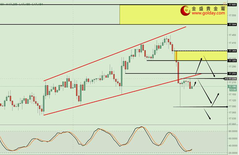 现货白银周一(10月16日)亚盘和欧盘高位震荡,美盘大幅走弱。上方关注17.2317.38美元/盎司一线,以及17.32-17.37美元/盎司阻力区间,下方关注前期低点17.10美元/盎司一线的支撑。若不破17.23一线,则可能继续走低,若上破我们选择反抽高位做空。